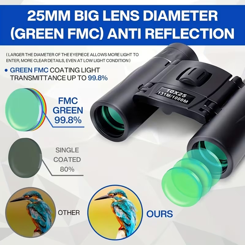 The green Fully Multi-Coated system increases light transmission to 99.8%, significantly reducing glare and ensuring bright, color-accurate images when using your BiniClaxi Binoculars in various lighting.