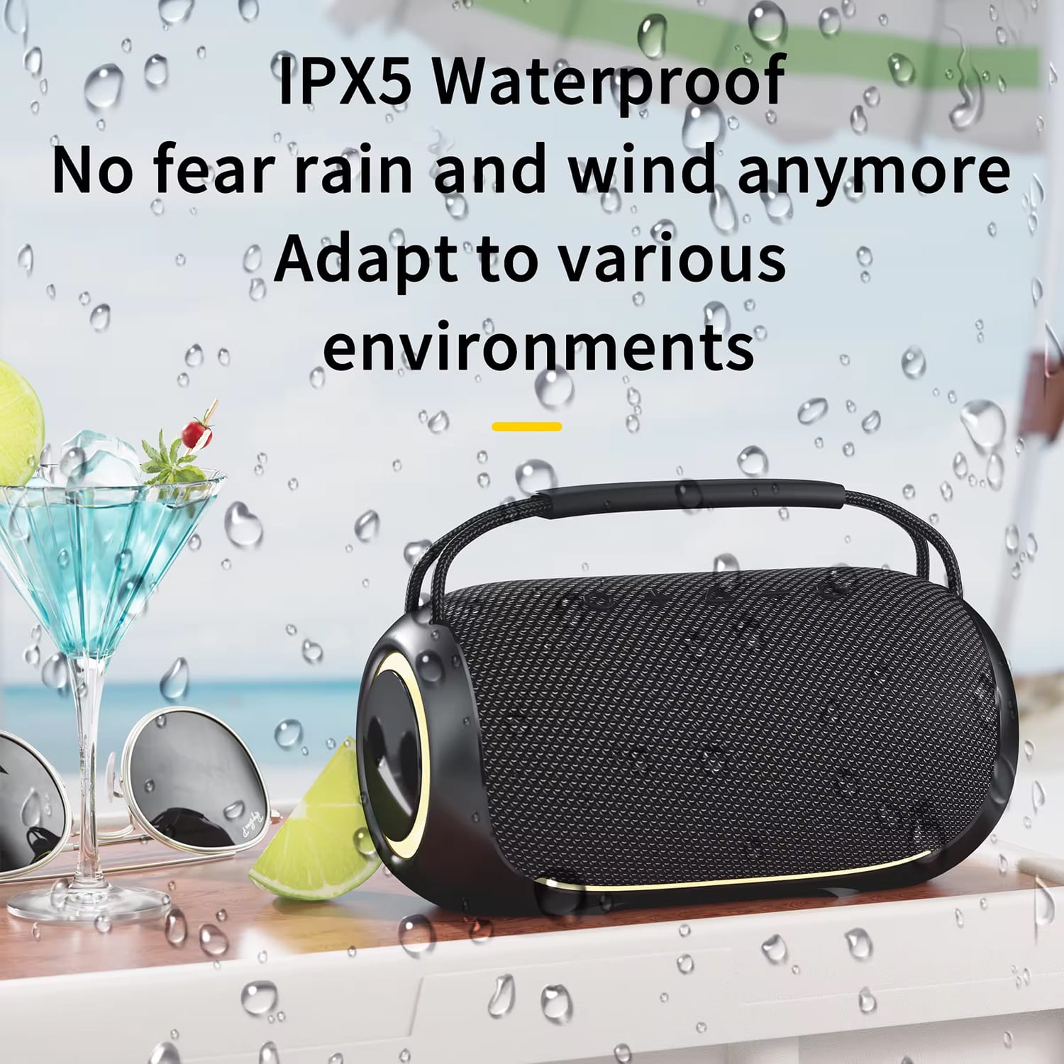IPX5 rating protects against water jets and splashes but not full submersion. The speaker handles rain, poolside splashes, and accidental spills perfectly but shouldn't be intentionally submerged underwater.