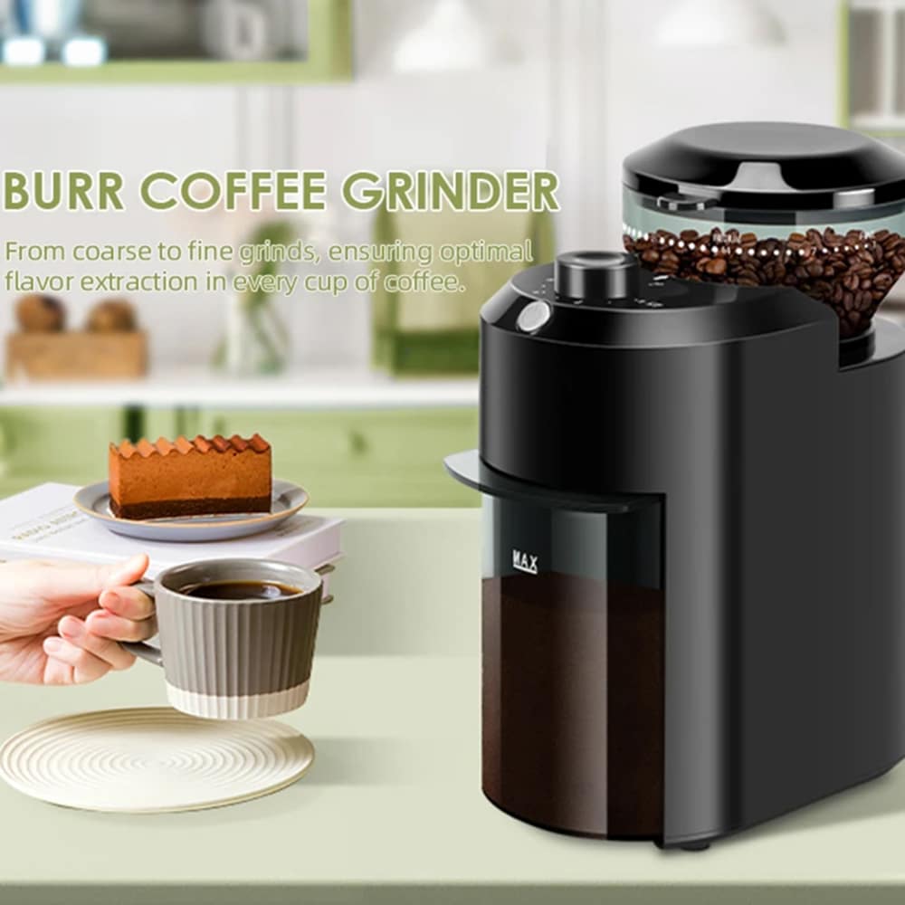 The 500ml container holds approximately 60-70 grams of ground coffee, enough for 12 cups. You can grind smaller amounts using the 2-12 cup selector. The auto-stop feature prevents overfilling and ensures you grind exactly the quantity needed each time.