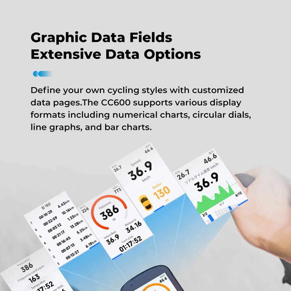 Create ten customisable pages with multiple layouts and over one hundred data fields to present metrics your way. The Cadnexura Bike Computer transforms complex numbers into clear, actionable cues for fuelling, gear shifting, and pacing decisions.