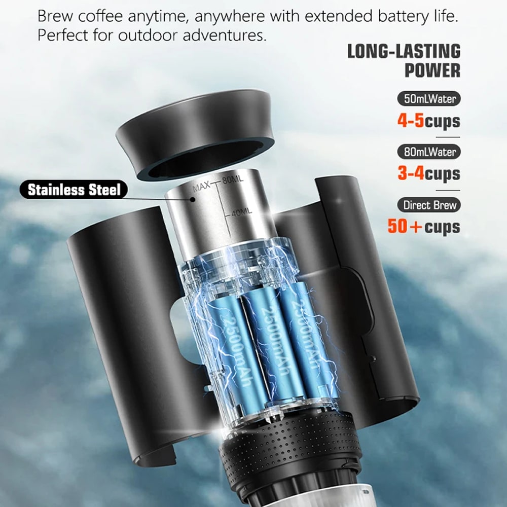 The battery lasts through my entire weekend trip without needing a recharge. I brewed several hot cups for my friends and still had power left for many more extractions later.