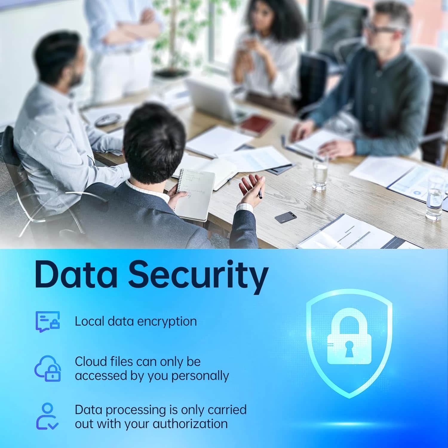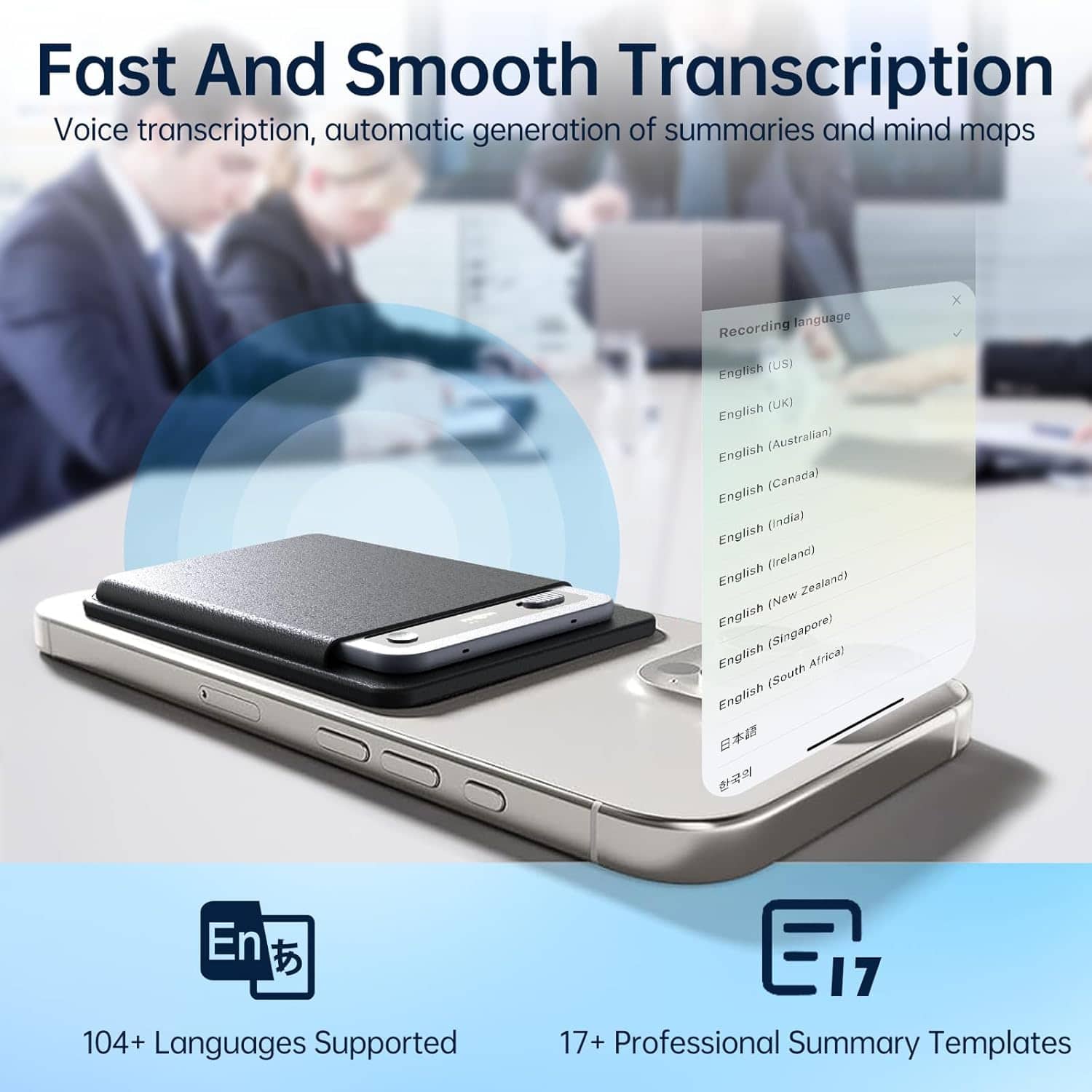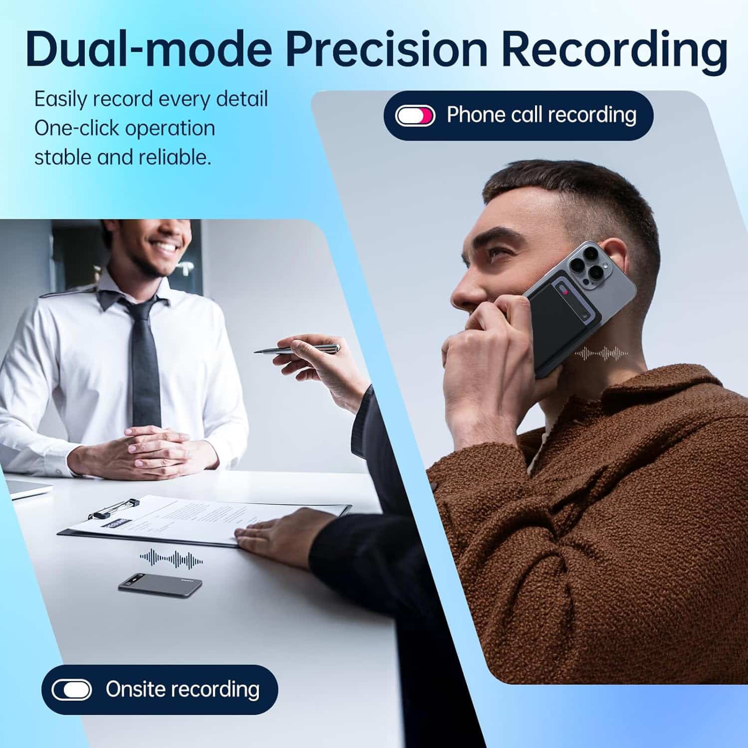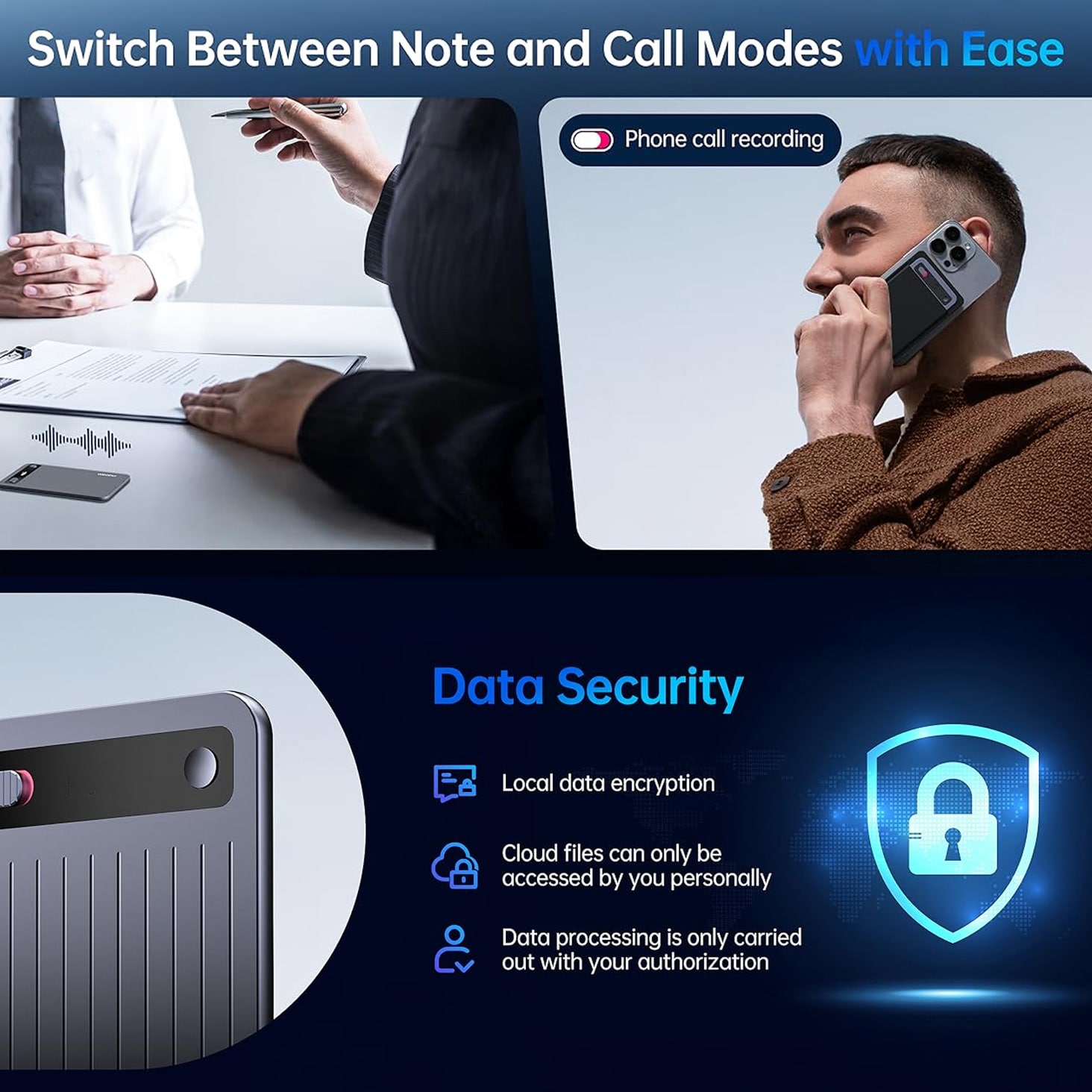 The device features excellent signal-to-noise ratio (≤98dB) and advanced audio processing that minimizes background noise, ensuring clear recordings even in challenging acoustic environments like busy offices or public spaces.