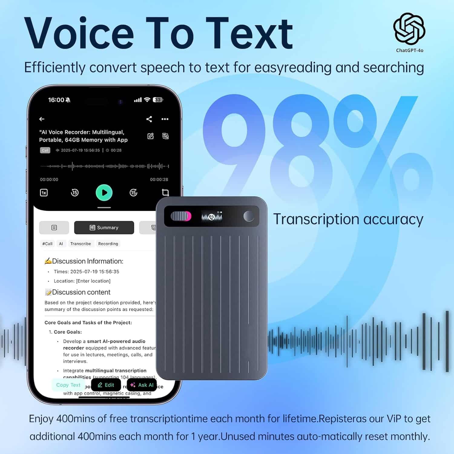 CriNotix AI Voice Recorder achieves 98% transcription accuracy using advanced ChatGPT-4.0 technology, ensuring reliable text conversion across various accents, technical terminology, and recording scenarios for professional-quality results.