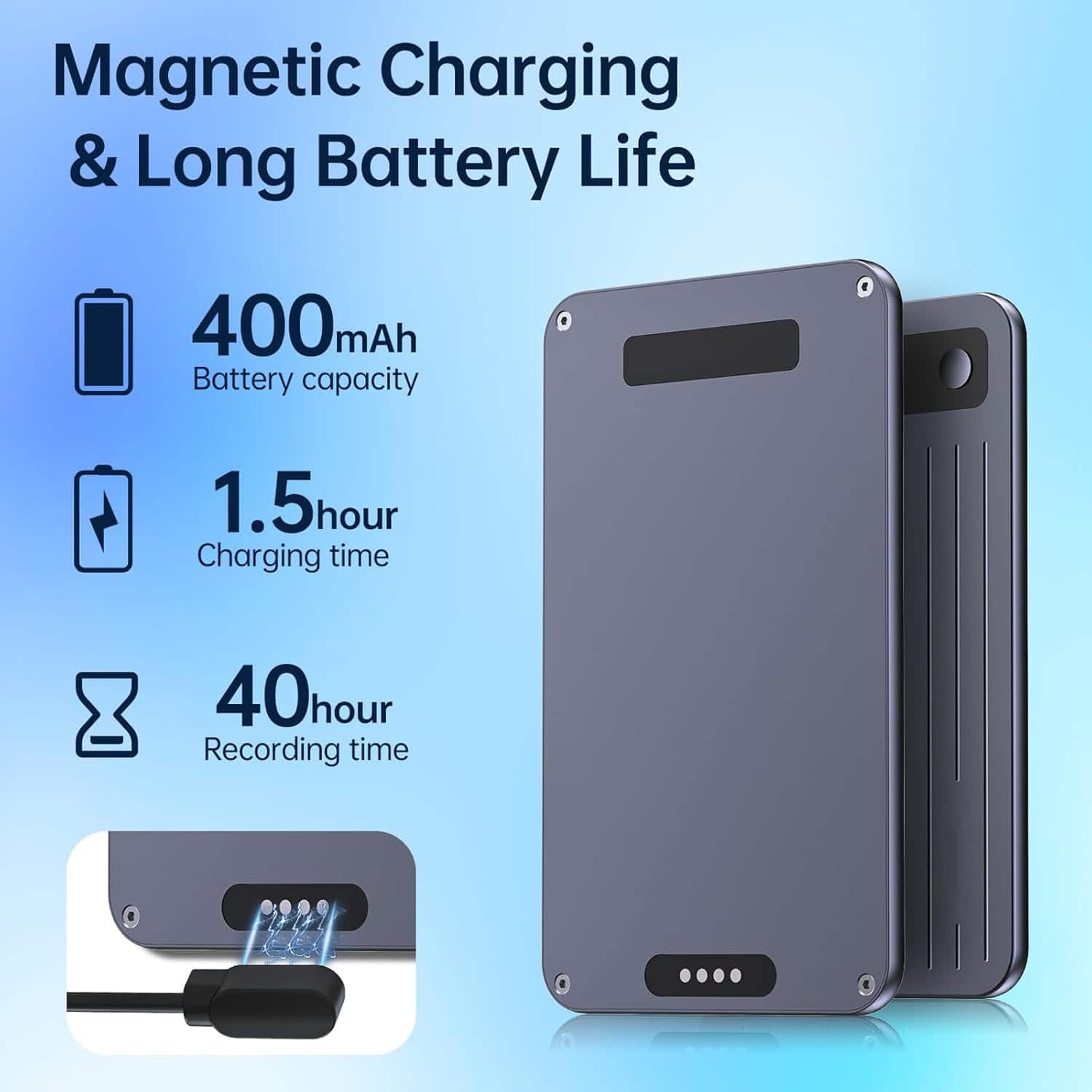 The device provides 50 hours of continuous recording with screen saver mode enabled, powered by a 400mAh rechargeable lithium battery that charges fully in just 1-2 hours for extended use.