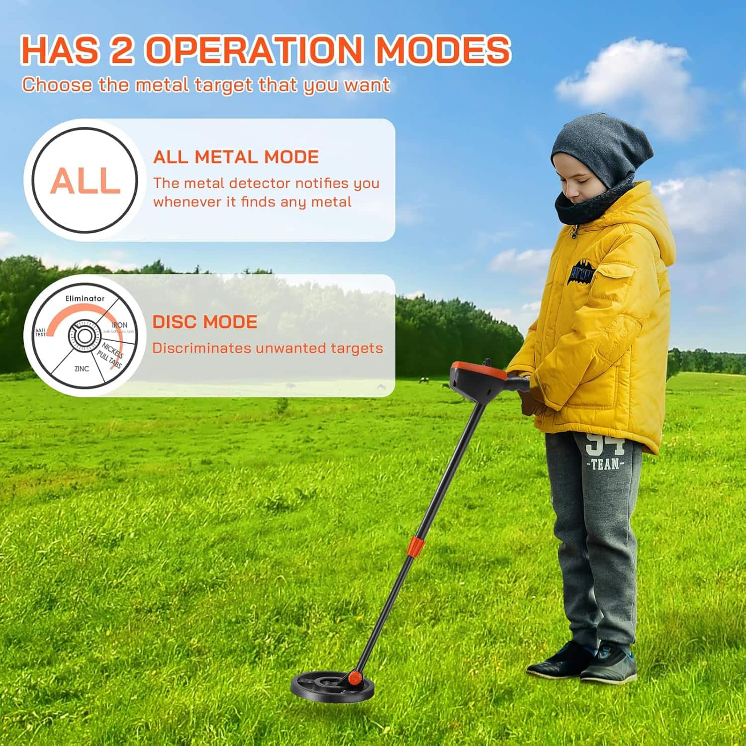 The Findytrex Metal Detector For Kids detects coins, jewelry, copper, gold, silver, zinc, iron, and aluminum. Both detection modes identify multiple metal types, with DISC mode allowing selective filtering of unwanted targets.