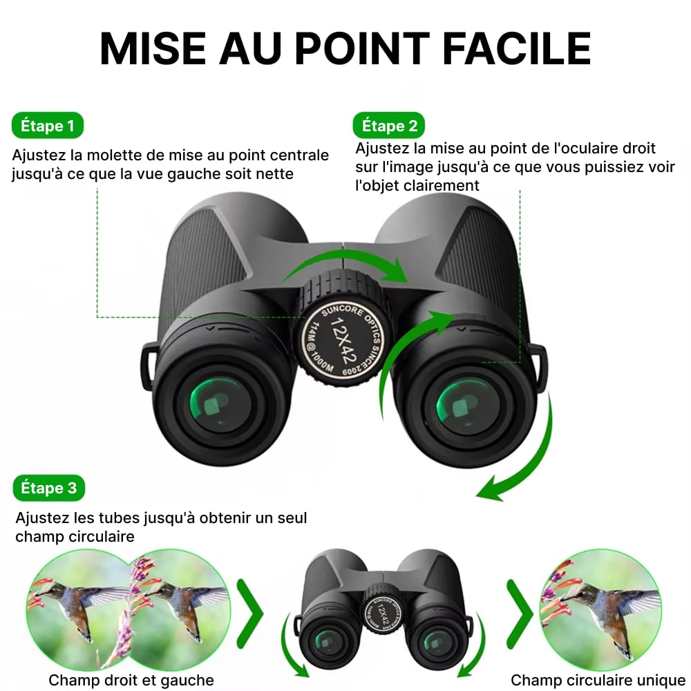 Use the simple 3-step system: adjust the center wheel for your left eye, fine-tune the right eyepiece, then align the barrels for a single circular view—takes just seconds.