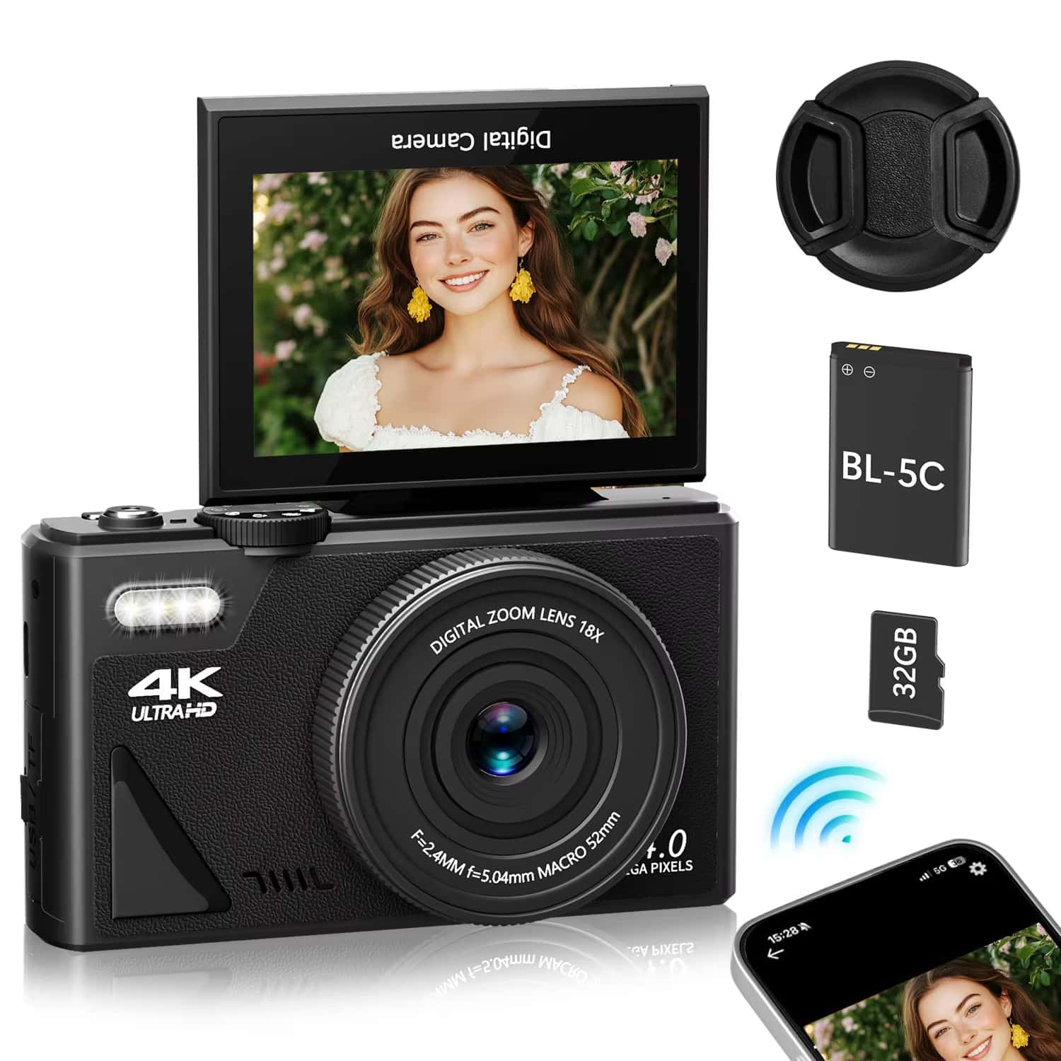 The package includes a digital camera, Type-C cable, lanyard, 32GB TF memory card, 1200mAh battery, camera bag, user manual, and lens cap.
