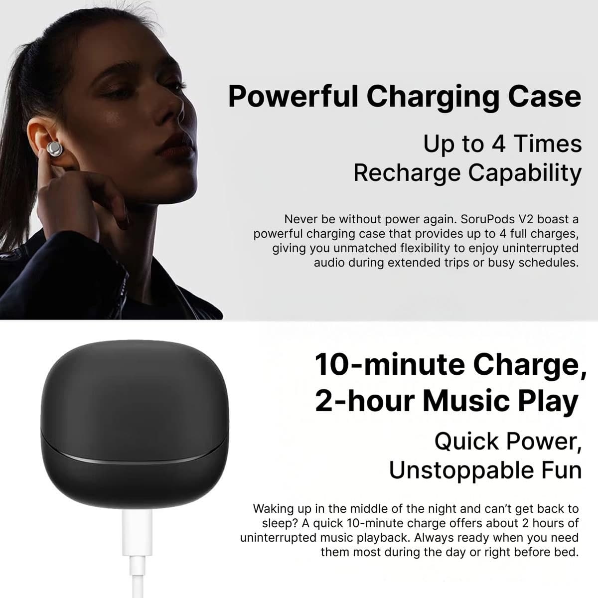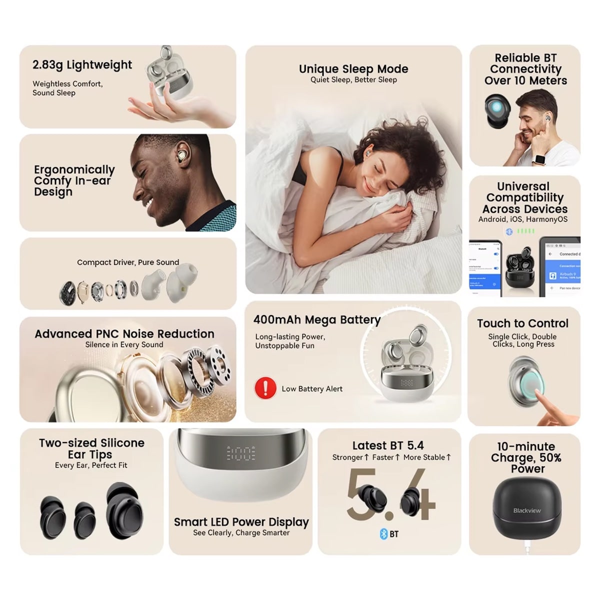 The robust 400mAh charging case provides hours of continuous playback, while rapid charging delivers 50% battery in just 10 minutes. This combination ensures your earbuds are always ready when you need them for naps or overnight use.