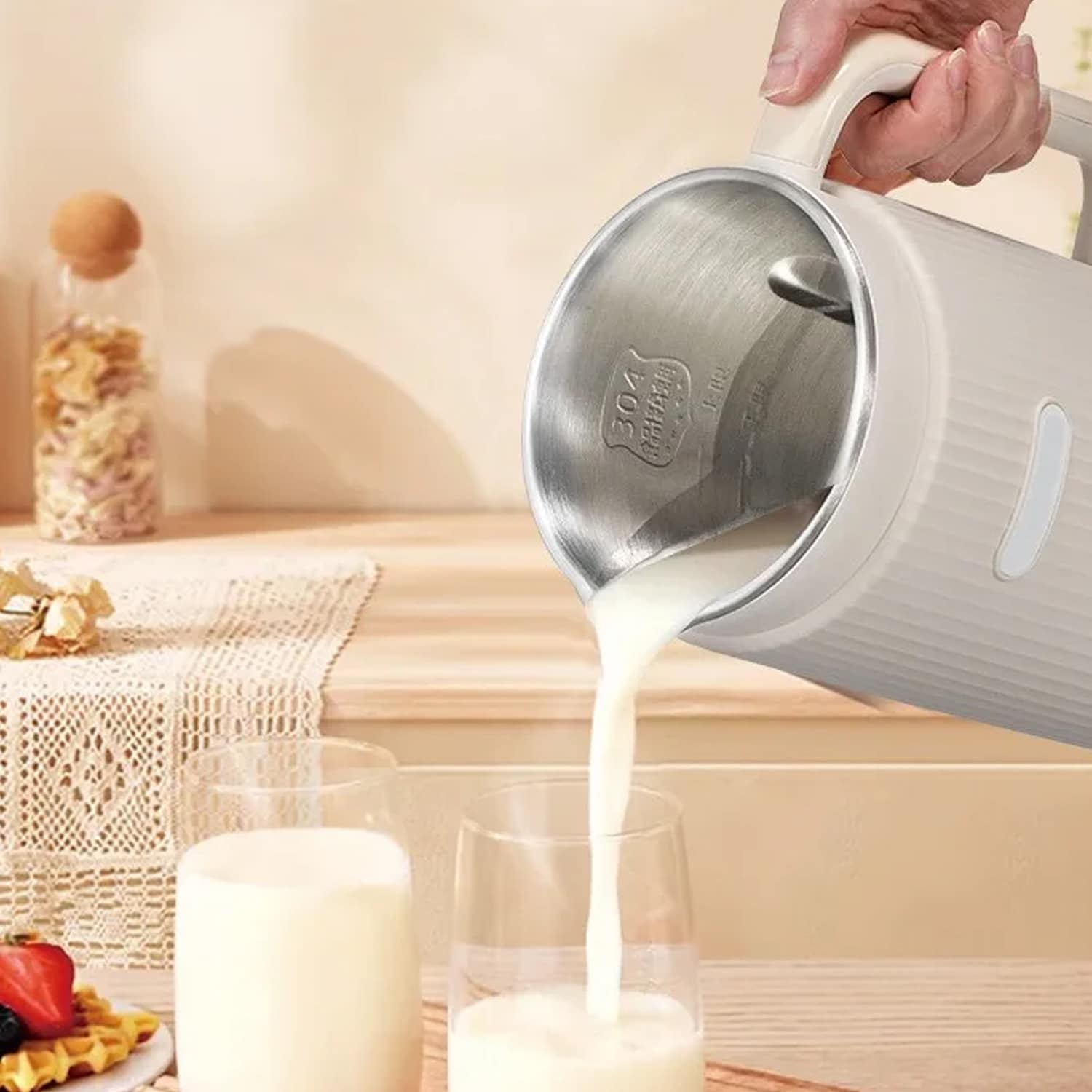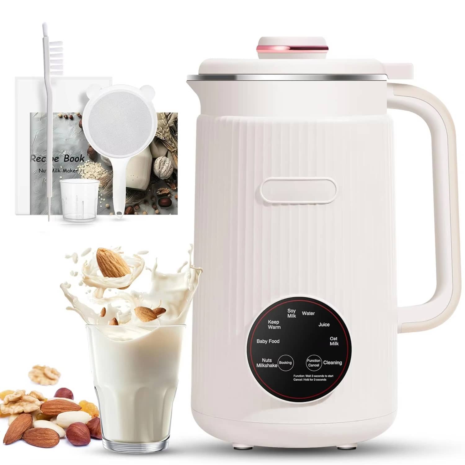 Everything you need comes included: nut milk bag, cleaning brush, measuring cup, power cord, recipe book, and instruction manual. Start creating delicious plant-based beverages immediately without purchasing additional accessories or equipment.