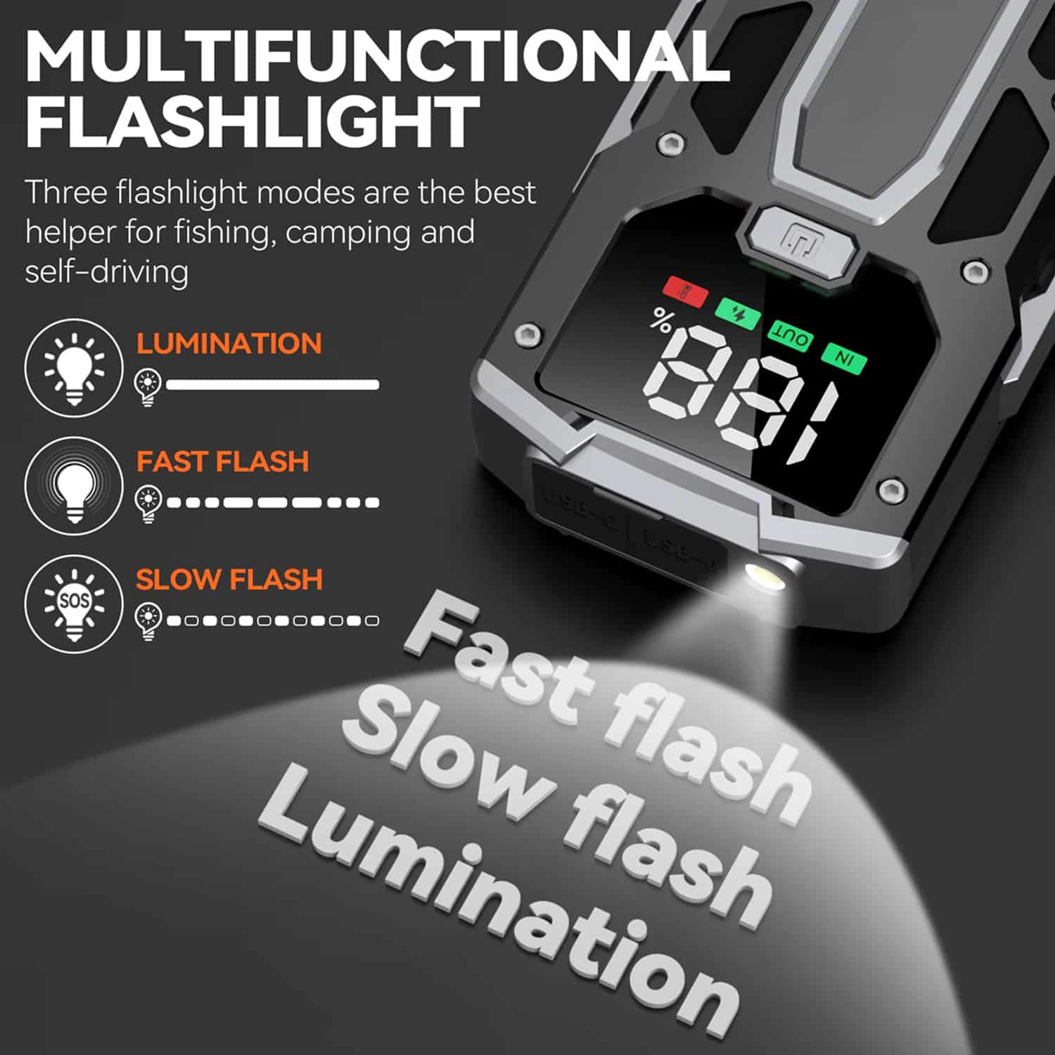 Beyond jump-starting, the OrisBend functions as a 26800mAh power bank for phones and tablets, plus offers three flashlight modes for emergencies, camping, and nighttime repairs.