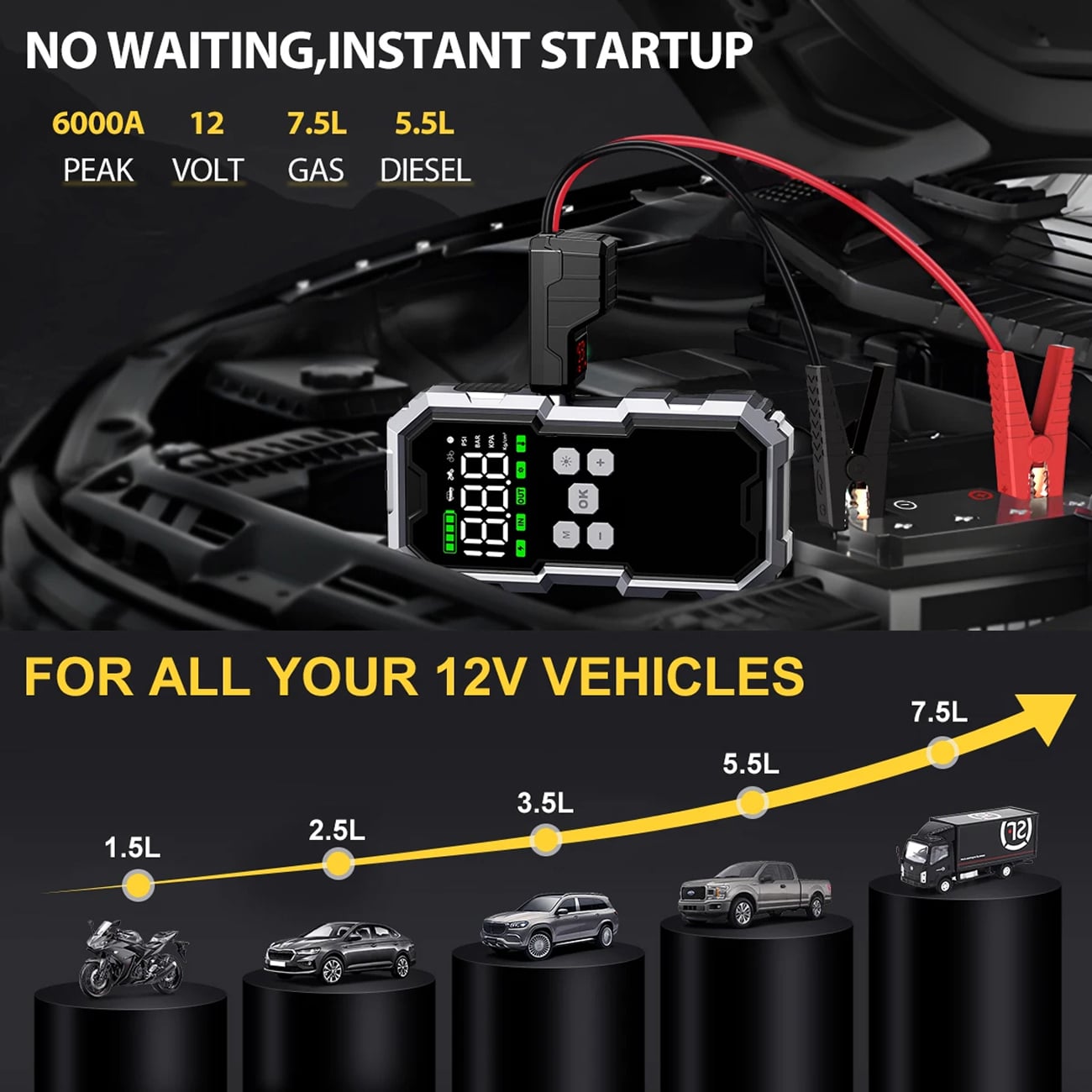 The StartZapo V2 works with all 12V vehicles including 1.5L motorcycles, 2.5L-5.5L cars, 7.5L SUVs, and up to 10L diesel trucks. It's designed for universal compatibility across your entire vehicle lineup.