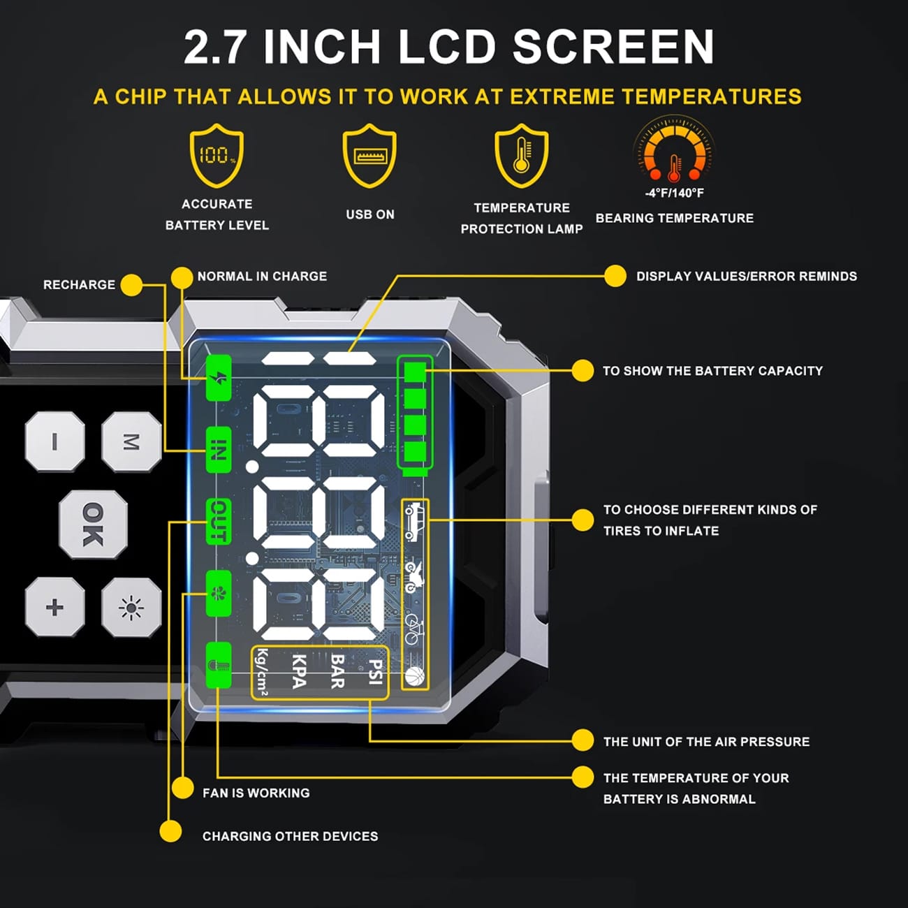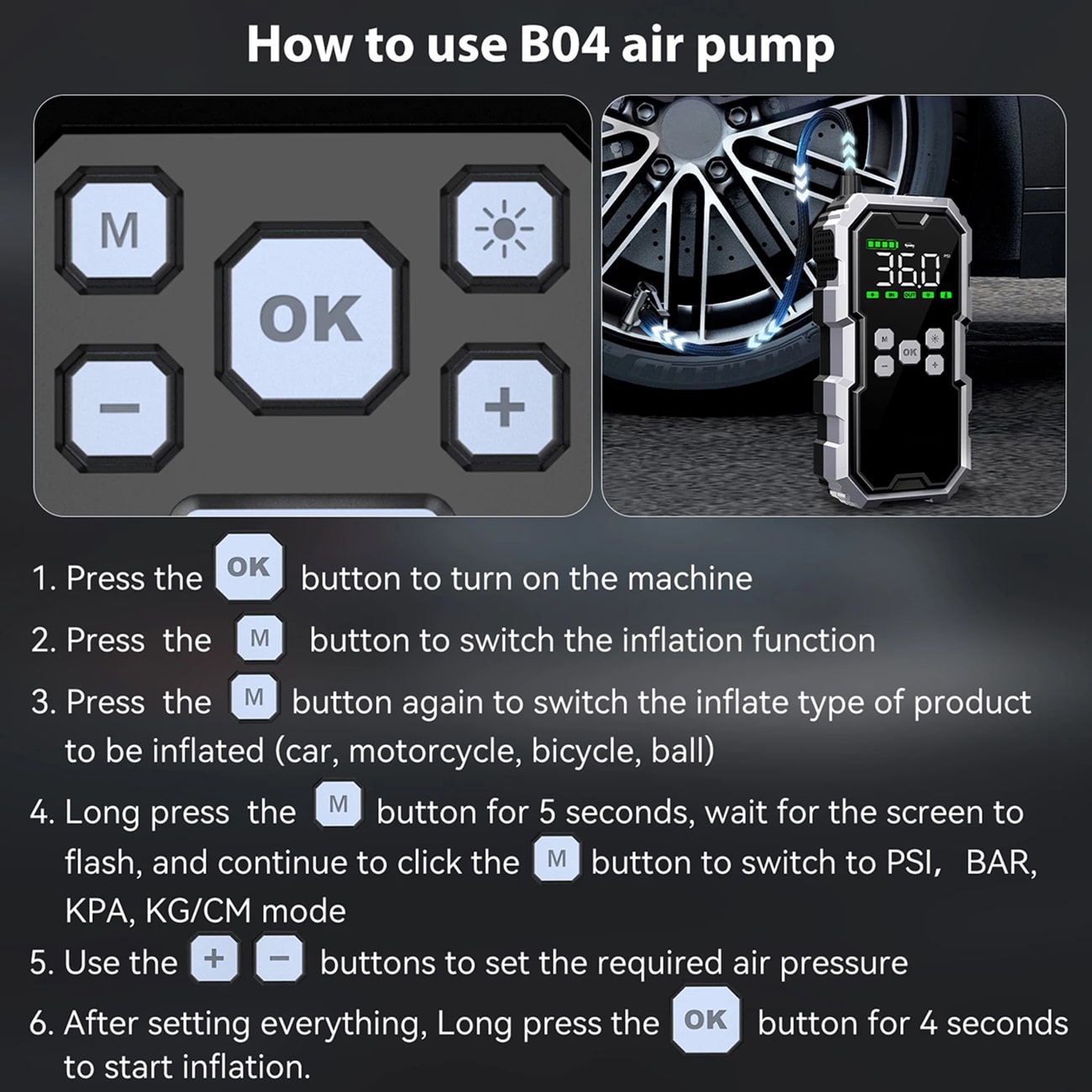 Absolutely. The 150 PSI air compressor handles car tires, motorcycles, bicycles, sports balls, and inflatable equipment. Multiple pressure unit options (PSI, KPA, BAR, Kg/cm²) ensure precision for any inflation need.