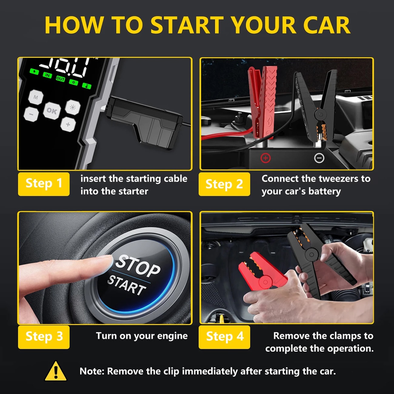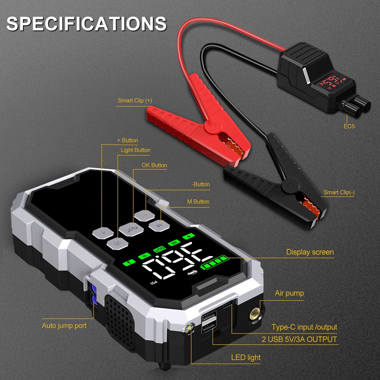The 26,800mAh capacity provides up to 40 jump-starts for standard vehicles on a full charge. Actual numbers vary based on engine size and battery condition, but most users get 30-40 starts easily.