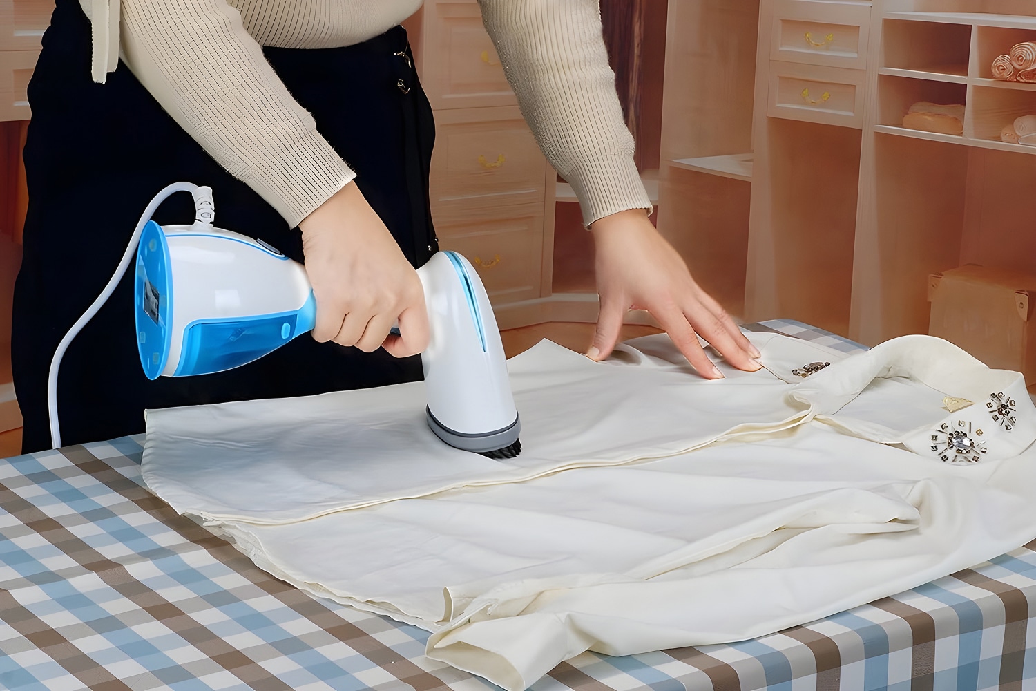 The device features a 2.0-meter cord, providing ample reach for steaming hanging curtains or reaching across large pieces of furniture without needing an extension.